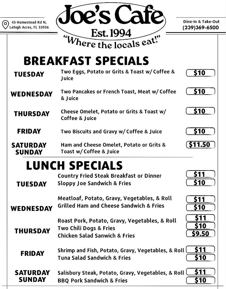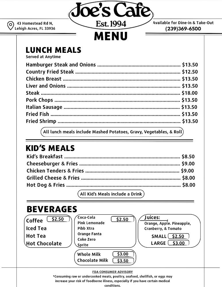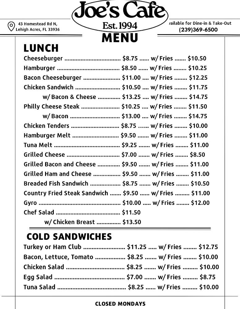 Café favorites such as hamburgers and chicken salads shine, showcasing a dedication to simple, hearty meals. Kids also enjoy their meal options, with friendly favorites like grilled cheese or chicken tenders. Beverages are affordable and refreshing, enhancing the dining experience. While the menu may not be extensive, each dish carries a sense of nostalgia and comfort. Joe’s Cafe focuses on quality over quantity, providing satisfaction with every bite.