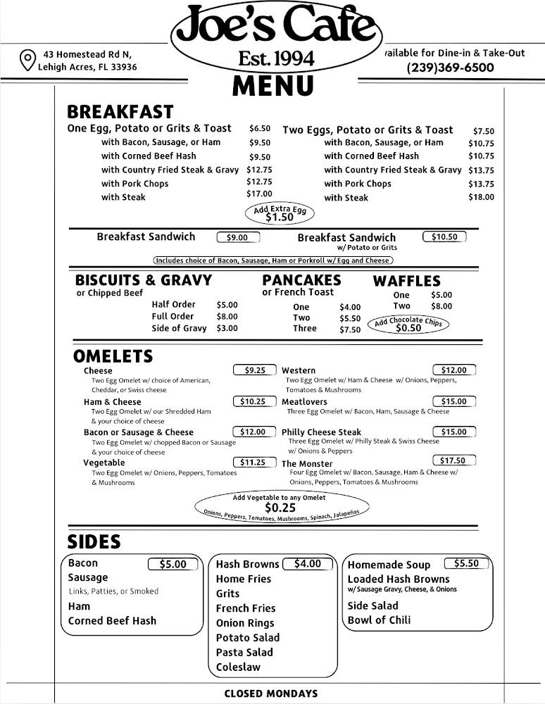 Joe's Cafe offers a delicious menu that caters to diverse tastes. Breakfast shines with options like omelettes, pancakes, and comforting biscuits. Most plates come with either grits or potatoes, ensuring everyone leaves full and satisfied. The lunch menu features mouthwatering sandwiches and classic comfort food.